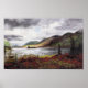 The landscape shows the turning of fall in red and golden hues, with some greens still holding on in the distant hills. The darker evergreens contrast with the lighter hues around them, their colours deepened by the rough elements and the passage of time. Cloud cover gently rushes by in shades of grey and silver, their light reflected on the surface of the water, quietly flowing in the wind. This scenic moment seems to demand a pause for reflection on all that has passed, and all that is still to come.