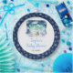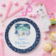 This cute and whimsical watercolor baby shower plate features a watercolor winter wonderland scene with adorable arctic animals, such as a polar bear, penguin, cat, owl, seal and a moose. In the background are the northern lights, snow capped mountains and trees. The text combines handwritten script and sans serif fonts for a stylish and modern look. Falling snowflakes and beautiful blue floral arrangements give a winter feel. This is perfect for winter and Christmas baby showers.