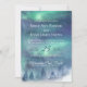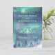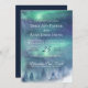 Romantic Northern lights inspired wedding invitation in shades of blue, purple and green watercolor with tall mountain pine trees and twinkling starry sky for a touch of sparkle.