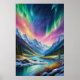 Nature's ethereal masterpiece unfolds as the northern lights paint the sky in a dance of vibrant hues. Over a snow-kissed green valley, the enchanting lights cast their spell, illuminating the peaceful scene. A gentle stream winds its way through the valley, reflecting the shimmering display above. Towering pines stand as witnesses to this cosmic spectacle, while distant mountains wear crowns of snow. A symphony of serenity and celestial wonder, where earth and sky unite in breathtaking harmony.
