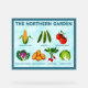 A humourous take on gardening in places with cold climates such as Alaska, Minnesota and Canada. You can't grow everything, but try those illustrated here: Yukon Chief sweet corn, snow peas, Yukon Chief tomato, January King cabbage, Yukon Gold potato, Icicle radish, and Iceberg lettuce. Each is labelled and text reading, "THE NORTHERN GARDEN" also appears. You may easily change the border colour or eliminate it completely.