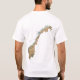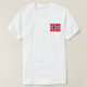 The front of this t-shirt bears a small Norwegian flag with its familiar white fimbriated offset blue cross on a red background, while the back displays a relief map of Norway. Available on t-shirts, sweatshirts, polos, long-sleeves and more.