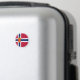 Stylised flag of Norway with the coat of arms superimposed and the name of the country on top - in Norwegian.