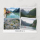 Postcard with a collage of four landscapes in Norway like a fjord, Ålesund, Geiranger and a mountain valley with photos with a white edge and one twisted like it is loose and with the text: 'Norway'. It is a great vacation souvenir.