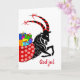 Custom front Christmas greeting card written in Norwegian. God jul on the cover can be altered by you if desired and a personal message included inside. Illustration of the Yule Goat, Julbukk, Bold illustration in high contrasting colours showing a goat with horns wrapped in red ribbon and carrying a gift bag full of gifts. Blank inside. Art, image, and verse copyright © Shoaff Ballanger Studios.