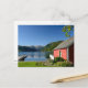 Postcard with a view over the fjord Hardangerfjord with some mountains and a red boathouse from Ulvik, Hordaland, Norway.
