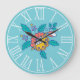 Norwegian folk art floral clock with white numerals and a sky blue background.