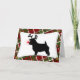 Fun Norwich Terrier Christmas Card has the dog breed silhouette, with reindeer antlers and a bright red glowing nose. The background is a cheery holiday plaid with reds and greens. The inside reads, "Wishing you and your family a wonderful holiday season!" Personalise the message to your own easily. Cute dog lover Christmas cards.