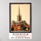 Restored and digitally enhanced poster for railroad travel showing houses in Norwich with the cathedral rising above them. Imperfections removed and colors corrected. Image courtes of Library of Congress.