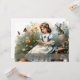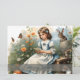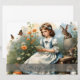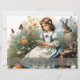 A young girl in a blue dress with white ruffles sits on a wooden bench in the middle of a flowering garden. She is reading a small card while butterflies fly around her. A hare and a small rabbit sit next to her, while other spring flowers bloom in warm colours in the background. The words "Happy Easter" give the picture a festive touch.