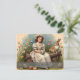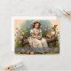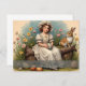 A young girl in a blue dress with white ruffles sits on a wooden bench in the middle of a flowering garden. She is reading a small card while butterflies fly around her. A hare and a small rabbit sit next to her, while other spring flowers bloom in warm colours in the background. The words "Happy Easter" give the picture a festive touch.