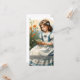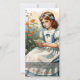 A young girl in a blue dress with white ruffles sits on a wooden bench in the middle of a flowering garden. She is reading a small card while butterflies fly around her. A hare and a small rabbit sit next to her, while other spring flowers bloom in warm colours in the background. The words "Happy Easter" give the picture a festive touch.