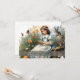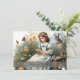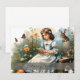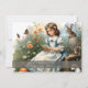 A young girl in a blue dress with white ruffles sits on a wooden bench in the middle of a flowering garden. She is reading a small card while butterflies fly around her. A hare and a small rabbit sit next to her, while other spring flowers bloom in warm colours in the background. The words "Happy Easter" give the picture a festive touch.