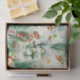 It has a repeating pattern with a soft, faded color palette, mostly in shades of mint green, white, and muted reds/golds.