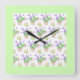 A pretty floral wall clock, with a pattern of pink Roses, creamy white Mock Orange Blossom and purple Lavender, in a light green border, from a handpainted watercolour design by Judy Adamson.