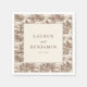 These wedding napkins feature a vintage-inspired design with a central beige frame surrounded by intricate pastoral landscapes in sepia tones, creating a warm and nostalgic feel. The layout is symmetrical, showcasing small houses and trees in an engraved style that adds texture and depth to the pattern. Elegant typography combines bold serif fonts for the names and date with a delicate cursive script for "and," enhancing the formal yet intimate atmosphere. Perfect for adding a touch of tradition and charm to your special day, these napkins celebrate love and unity in a timeless countryside setting.