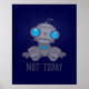 Vector cartoon illustration of a cute, but sad little robot with blue eyes sitting on the floor with Not Today text. Tags: robot, droid, android, machine, future, sad, upset, cute, humour, cartoon, grief, frown, depressed, depression, lonely, adorable, blue, grey, not, today, busy, procrastinate, lazy