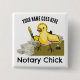 Advertise your mobile notary or loan signing agent business with a touch of humour. Whimsical design features a cute yellow chick surrounded by piles of documents and a bottle of jet blank ink. She's holding a delicate yellow feather quill, over the slogan "Notary Chick." Personalised button makes a great gift for any notary professional who provides a valuable service to the public. This notary chick design is suitable for white and light-coloured backgrounds. Customise by changing "Your Name Goes Here" to a name, location, or any other text of your choice. Design tip: For long names you may need to adjust text size down.