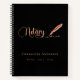 A chic black background, decorated with a feather pen. Personalise and add a name and title. Golden text: Notary