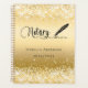 A faux gold looking background, decorated with a feather pen. Personalise and add a name and year(s). Black text: Notary