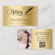 An elegant and glamourous business card on a faux gold looking background decorated with a black signature signing pen. Elegant hand lettered style script. Personalise and add Your name, text, profile photo, contact info and your own QR code to your website address.