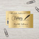 An elegant business card on a faux gold metallic looking background and a black signature signing pen. Elegant hand lettered style script. Personalise and add Your name, title, contact info and your own QR code to your website address.