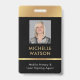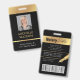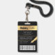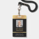 Modern Photo ID badge in black and gold with space for a custom profile photo, job title, contact details, services and barcode. This elegant employee name badge features black background and faux gold effects with fully editable text and a photo.
