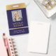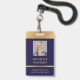 Modern Photo ID badge in navy blue and gold with space for a custom profile photo, job title, contact details, services and barcode. This elegant employee name badge features dark blue background and faux gold effects with fully editable text and a photo.