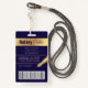 Modern Photo ID badge in navy blue and gold with space for a custom profile photo, job title, contact details, services and barcode. This elegant employee name badge features dark blue background and faux gold effects with fully editable text and a photo.