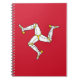 This notebook prominently displays the flag of the Isle of Man, showcasing its distinctive triskelion symbol on a bold red cover. The triskelion, with its three armored legs joined at the thigh, symbolizes resilience and determination, reflecting the island's motto "Quocunque Jeceris Stabit," which translates to "Whichever way you throw it, it will stand."