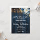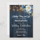 An elegant Wedding Invitation with elegant calligraphy completed by wonderful blue wood, garden string lights and white blue floral with gold glitter. You can personalise this card with your Wedding details.