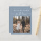 Budget-friendly dusty blue elopement or small private wedding announcement and casual reception invitation featuring your photo and "Nothing Fancy Just Love" in a mix of simple white typography and an elegant white script with swashes. Under your photo, add your first names and wedding or reception date. On the reverse side, personalise your invitation and add your names in a signature-like white script. This budget semi-gloss paper is similar in weight to photo paper. A larger 5x7 traditional card stock version is also available (message us for the link).
