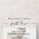 Modern light cream elopement or private wedding announcement and casual reception all in one invitation. Your marriage announcement and reception invitation overlays your photo, and "Nothing Fancy Just Love" is showcased in a blend of simple lettering and a chic script with swashes. A tear away RSVP postcard provides a convenient and envelope-free response from your guests.
