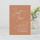 Perfect for couples extending their joyous occasion, this invitation exudes sophistication with a hint of playfulness, setting the stage for a memorable event. Adorned with a timeless modern script design, with white text on terracotta brown copper background, it adds a touch of refined charm to your wedding. Perfect for weddings, vow renewals, engagement parties, or intimate wedding reception, lunch, brunch and dinner, in celebrations of love.