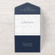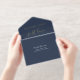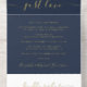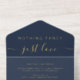 Elegant dark navy blue elopement or private wedding announcement and casual reception all-in-one invitation featuring "Nothing Fancy Just Love" showcased in simple lettering and a chic script with swashes, your marriage announcement and reception invitation, and a white tear-away RSVP response postcard, all rendered in your choice of genuine gold, silver or rose gold foil.