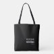 Stylish custom minimalist BLACK tote bag, with text that reads NOUVEAU MINIMO, which is a mash-up of French and Spanish, and loosely translates as 'new minimalist' and refers to a new way of thinking after a pandemic pivot. Underneath there is a placeholder name. All text is customisable so you can change as required and add your own wording. Text is right justified. Design is repeated on the back. Comes in other colours.