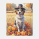 A watercolor-style painting of a cheerful dog sitting amidst a pile of vibrant fall leaves, surrounded by tiny pumpkins and scattered acorns. The dog wears a little pilgrim hat and beams with joy, capturing the spirit of Thanksgiving. In the background, soft harvest fields and golden-hued trees create a peaceful countryside ambiance. Gentle textures and warm, muted autumn tones give the scene a cosy, nostalgic feel perfect for celebrating the beauty of the season.