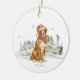 Celebrate the playful charm of the Nova Scotia Duck Toller with this beautifully illustrated holiday ornament. The front features a festive Toller in a snowy lakeside scene, complete with a Santa hat, winter scarf, and gentle birds perched on a weathered dock. On the back, you’ll find a poetic breed description and pronunciation guide that captures the Toller’s spirit: clever, loyal, and always full of energy.