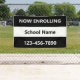 This school enrolment banner says 'Now Enrolling'. The text can be changed to show a custom message such as the school's name. Digits for your phone number are at the bottom.