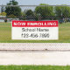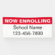 The top line of the display text is white and says NOW ENROLLING. The second line of the text is black and is for a custom message (Shown: School Name). The bottom line has black display digits for a phone number. All text can be edited or deleted.