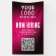 Now Hiring Banner with QR Code: Capture attention and streamline your hiring process with this eye-catching banner. Featuring the distinctive magenta grunge gradient background, this banner prominently displays your company's logo alongside a QR code that links directly to your online job listings. Ideal for job fairs, corporate events, or placement outside your business premises, this banner effectively communicates your hiring needs while reinforcing your brand identity.