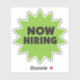 Now Hiring vinyl sticker for business or vehicle window or display. Strong black letters on a green starburst background for an attention getting notice to potential employees.