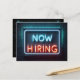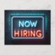 A neon sign against a dark brick wall displays the words "NOW HIRING" in bright blue and red letters for business employment.