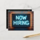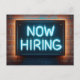 A neon sign against a brown brick wall displays the words "NOW HIRING" in bright blue for business employment.