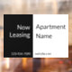 This is a black and white window cling is a text template. You can edit it to show a custom message. (Shown: Now Leasing Apartment Name) There are also placeholder digits for a phone number and placeholder text for your website. All text can be edited or deleted.