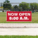 Grow your business with this Now Open Custom Time Business Banner. It is designed with a customisable red background and large bold minimal lettering. The text is "now open" followed by customised time and you can change the words if needed by clicking the personalise template option. Available in different sizes.