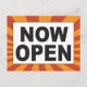 Now Open business advertising card features colourful orange and red sun rays in a retro pattern with bold attention-getting Now Open. Add your business information on the back and use to announce your presence to friends and community.