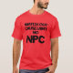 The graphic, with the acronym "NPC" (non-player character) at the end of a warning statement, conveys a clear message: "Be cautious, I'm not an NPC." (non-player character) .This warning is directed at those viewing the shirt, suggesting that others shouldn't expect a passive reaction or lack of response, as the person is ready to take action if something goes wrong. The image may reflect the determination and assertiveness of the person wearing the shirt, conveying the idea of active participation in managing their own experiences.