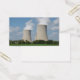 Twin cooling towers of a nuclear electric power utility plant belch white billowing clouds of steam into the blue skies of the rural countryside.