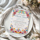 This Nuestra Boda Flowers Botanical Spanish Wedding Invitation design showcases a rich and vibrant floral arrangement around the edges, with bold colors like red, orange, blue, purple, and yellow that create a festive and welcoming feel. The flowers are intricately combined with leafy patterns and small, detailed embellishments, giving the design a lively and textured look. The balance of bright, contrasting colors and the delicate, symmetrical arrangement make this an eye-catching option for a celebratory wedding stationery, especially one with a traditional or folkloric theme.